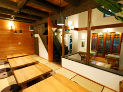 【Restaurant**】 木のぬくもりのある 吹き抜けの明るいレストランでのお食事。 ボサノバに、ハワイアン・・・ 心地よい音楽を聞きながら、ゆったりとした寛ぎの時間を。 |